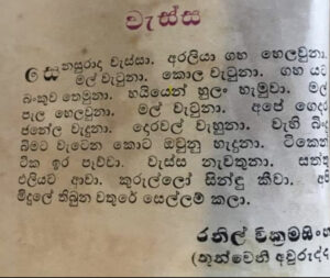 ඒ කොහොම වෙතත් 1957 අවුරුද්දේ රෝයල් කොලීජියේ තුන වසර අධ්යාපනය හදාරන විට රනිල් රාජපක්ෂ පාසලේ සමරු කලාපයට රචනාවක් ලියා තිබේ.රචනාවේ මාතෘකාව වැස්සයරචනාව ලියා ඇත්තේ මෙහෙමය.සෙනසුරාදා වැස්සා.අරලිය ගහ හෙලවුනා.මල් වැටුනා.කොල වැටුනා.ගහ යට බංකුව තෙමුනා.හයියෙන් හුලං හැමුවා.අපේ ගෙදර ජනේල වැදුනා.දොරවල් වැහුනා.වැහි බිංදු බිම වැටෙන කොට ඔටුනු හැදුනා.ටිකෙන් ටික ඉර පෑව්වා.වැස්සනැවතුනා.සත්තු එළියට ආවා.කුරුල්ලෝ සිංදු කිව්වා.අපි මිදුලේ තිබුණ වතුරේ සෙල්ලම් කෙරුවාරනිල් වික්රමසිංහ(තුන්වෙනි අවුරුද්ද)මොනවා වුනත් කුඩා කාලයේදීම බටලන්දේ රනිල් අනාගතය දැක ඇතැයි අපට සිතේ.අප ඒ රචනාව ගැන මෙසේ සිතමු9/5 රැස්වීමක් තිබ්බා.අරලිය ගහ මන්දිරය පිරෙන තරමට සෙනග ආවා.අන්තිමේදි ආපු සෙනග නිසා රට පුරාම ප්රශ්න ඇතිවුනා.අගමැති පුටුව නැතිවුනා.අරලිය ගහ මන්දිරය පාළු වුනා.පස්සෙ හදිසි නීතිය දැම්මා.මිනිස්සු බය වුනා.අපේ ගජ මිතුරන් සතුටු වුනා.රටේ තියෙන ප්රශ්ණ අස්සෙ අපි ගේම් ගහන්න ගත්තාඑච්චරය.