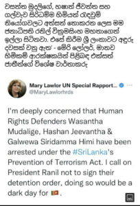 රනිල් රාජපක්ෂ ජනපතිවරයා විසින් අන්තර් විශ්ව විද්යාල බල මණ්ඩලයේ කැඳවුම්කරු වන වසන්න මුදලිගේ ඇතුළු තව දෙදෙනෙකු ත්රස්තවාදීන් ලෙස නම් කොට දින අනූවක රැඳවුම් නියෝග ගැනීම සඳහා සැළසුම් කර තිබියදී ඔවුන් මානව හිමිකම් ආරක්ෂකයන් බව සඳහන් කර එක්සත් ජාතීන්ගේ මානව හිමිකම් ආරක්ෂකයන් පිළිබඳ විශේෂ නියෝජිත මේරි ලෝලර් ට්විටරයක් නිකුත් කර තිබේ