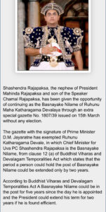 ශෂින්ද්රව කතරගම නිලමේ කොට ඇත්තේද මහින්ද රාජපක්ෂ විසින් අතිවිශේෂ ගසට්ටුවක් ගසාය එය අංක 1807/39 අනුව කතරගම බස්නායක නිලමේ ලෙසට ඔහුව ඡන්දයකින් තොරව පත් කොට තිබේ. රාජපක්ෂලා විහාර දේවාල ගම් පනත පවා පයිසෙකට මායිම් නොකොට දෙයියන්ගේ සල්ලි හොරා කා තිබේ.