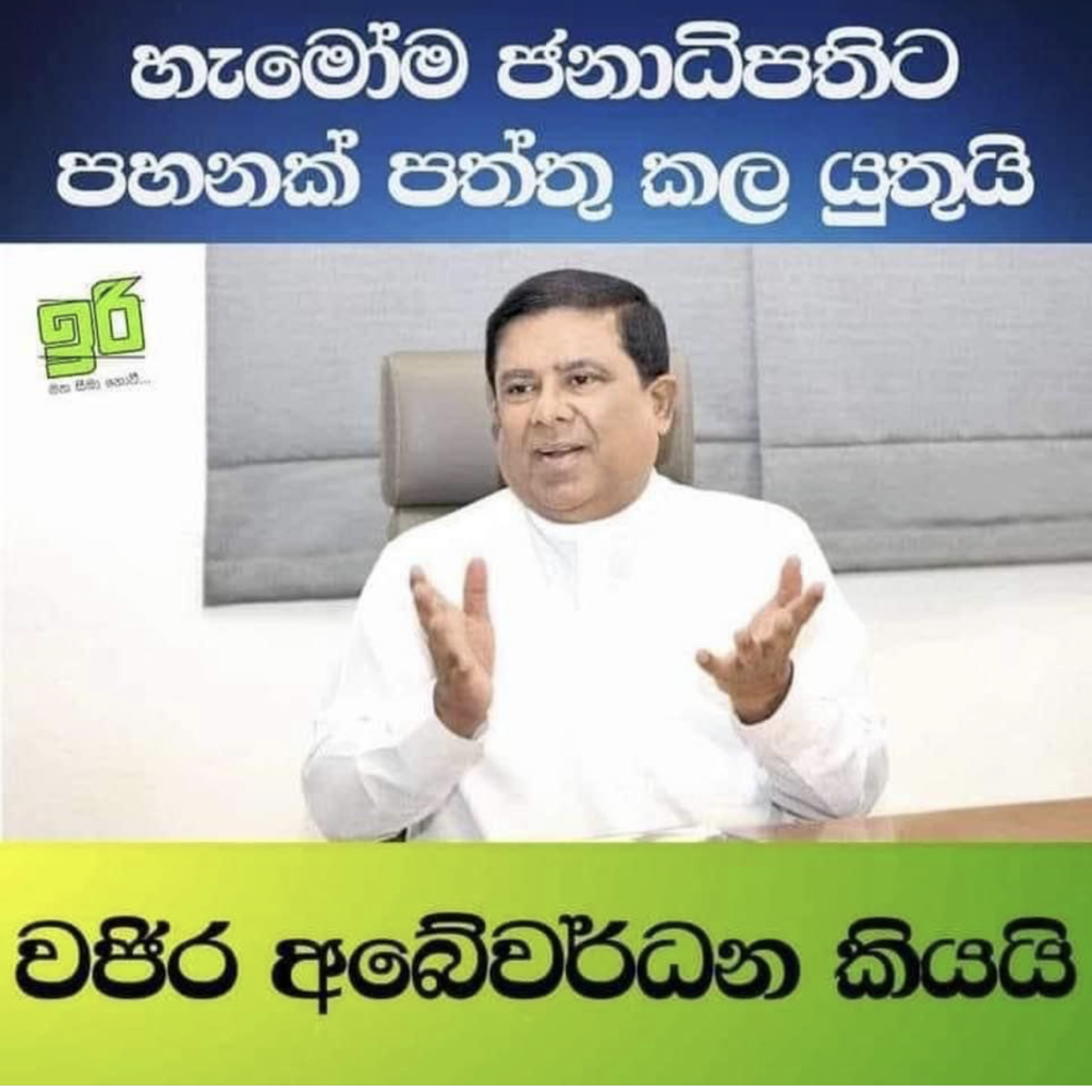පත්තු කළ යුතු බව පාර්ලිමේන්තු මන්ත්රී වජිර අබේවර්ධන උන්දෑ කියා තිබේ.ඒ රට බේරගත් නායකයා ඔහු නිසා බවද වජිර අබේවර්ධන උන්දෑ වැඩිදුරටත් එහිදී පවසා ඇත.වජිර අබේවර්ධන උන්දෑ ඒ ඉල්ලීම කරන්නට පෙර එක පාදඩ බල්ලෙකුටවත් එවැන්නක් සිහිපත් නොවීම හරිම කණගාටුය.