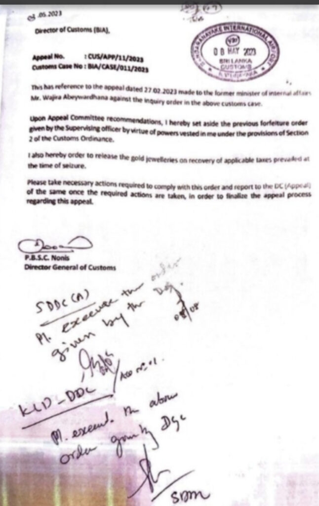 අභියාචනා කමිටු නිර්දේශ මත රේගු ආඥා පනතේ 2 වන විධිවිධාන යටතේ තමන් වෙත පැවරී ඇති බලතල අනුව අධීක්ෂණ නිළධාරියා ලබා දුන් පෙර රාජසන්තක කිරීමේ නියෝගය මෙම ලිපියෙන් ඉවත් කරන බවද රේගු අධ්යක්ෂ ජනරාල් වරයා බණ්ඩාරනායක ජාත්යන්තර ගුවන් තොටුපොළ රේගු අධ්යක්ෂ වෙත දන්වා තිබේ.ඉන් පසුව අත් අඩංගුවට ගන්නා අවස්ථාවේ පැවති අදාල බදු අය කර ගැනීම මත රන් ආභරණ නිදහස් කිරීම මත රන් ආභරණ නිදහස් කිරීමටද මෙහිදී රේගු අධ්යක්ෂ ජනරාල් නියෝග කර ඇත.